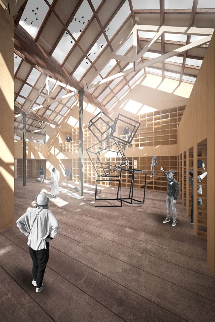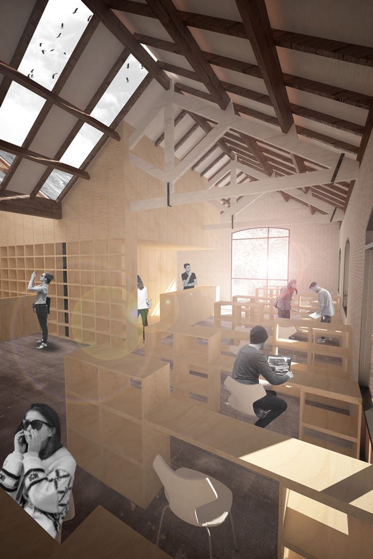 Un espacio de filmoteca, diseñado como un virus que invade un edificio fabril preexistente, donde se permite que el mobiliario se ajuste y adapte con el paso del tiempo. Basado en un único módulo, desmontable, ajustable, y apilable, que adapta su forma a las necesidades de cada área del edificio.