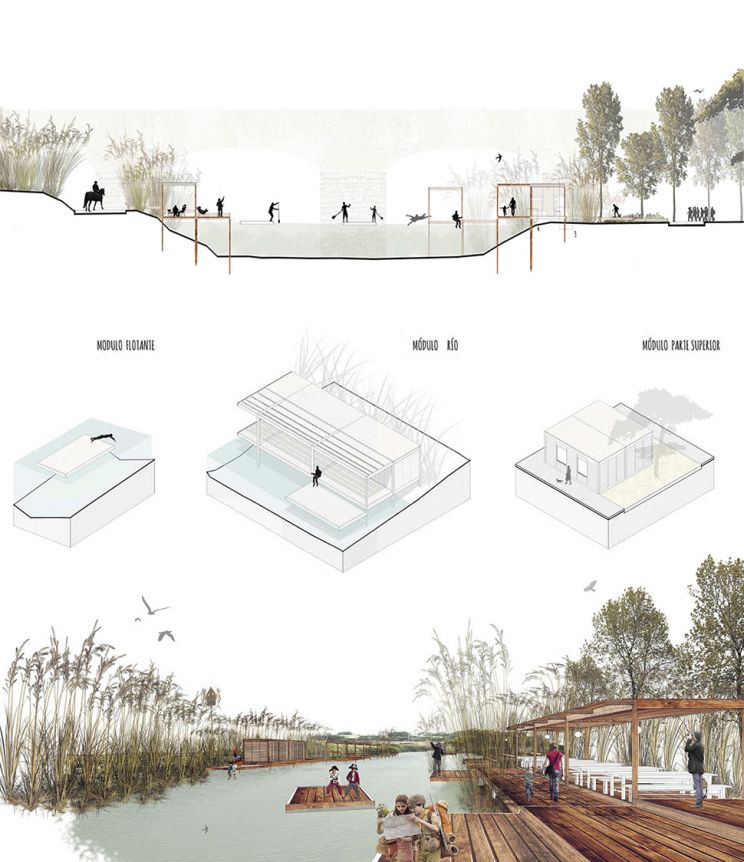 Se pretende vertebrar un eje regional apoyándose en el propio río, creando así un lugar público de encuentro y actividades deportivas que se desarrollarían en módulos de plataformas-muelles-embarcaderos. De ésta manera se soluciona el problema de los accesos al río y se controla la presencia de las cañas invasivas en la ribera. Se pone en valor el río y su entorno potenciando las características del lugar para hacer de él un entorno extraordinario para la temática de una colonia juvenil.