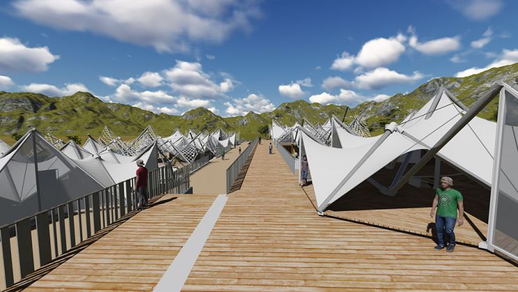 Para resolver el programa se piensa en una arquitectura lo más efímera y ligera posible, que simplemente se apoye sobre las prexistencias. Se tratan de módulos Tensegrity de doble capa, unos módulos de planta hexagonal que permite crecer y decrecer según las necesidades y grupos acogidos.