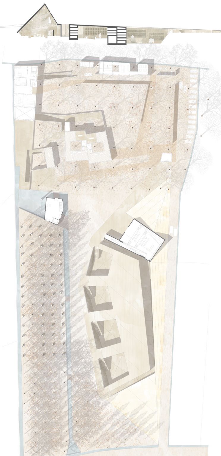 Una tapia surgida de la propia Vega, una colina vegetal de tonos blancos, nos lleva a la Noguera del Velatorio, un bosque dónde nos despediremos del ser querido entre sus troncos. La hoja caduca de este bosque y la reforestación de chopos, convierten el cementerio en un paisaje cambiante en cuanto a luz y cromatismo a lo largo del año. Al salir del bosque, nos despedimos dentro de la propia Vega,tras la tapia y teniendo la posibilidad de vislumbrar el rito funerario cobijado bajo los bosques.