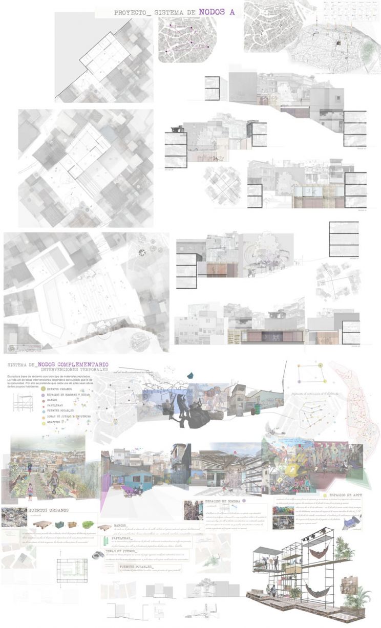El proyecto busca recuperar la favela y sumarse al movimiento, un proyecto realizado en su totalidad con materiales reciclados y con la participación de sus habitantes. Se plantean varias intervenciones, espacios polivalentes interconectadas entre si, teatro que se vuelven plaza, lugar de reunión, cine, escuela… Es el desahogo de un lugar congestionado. El proyecto se concibe a base de suma de FRAGMENTOS y materiales dispares del lugar. Busca el EQUILIBRIO entre lo temporal y lo permanente.