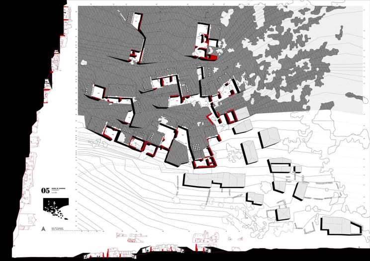 Todo comienza con las ruinas, conectadas entre sí, con una estructura perimetral, generando espacios entre lo nuevo y lo preexistente. Por último, enterrar con tierra, formando patios. El resultado es un hormiguero de espacio público.