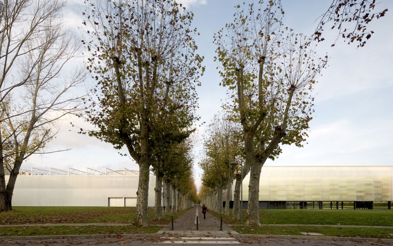 El nuevo Pabellón polideportivo se ubica en los terrenos que poco antes ocupaba una masa frondosa de árboles. Así, la fachada pixelada del edificio reproduce los tonos verdes de las hojas y sus sombras. Por delante de ésta, una segunda envolvente de policarbonato difumina los colores de la fachada y la dimensión real del edificio. Con esta doble piel, la imagen del edificio cambia según el momento del día o el ángulo de visión.