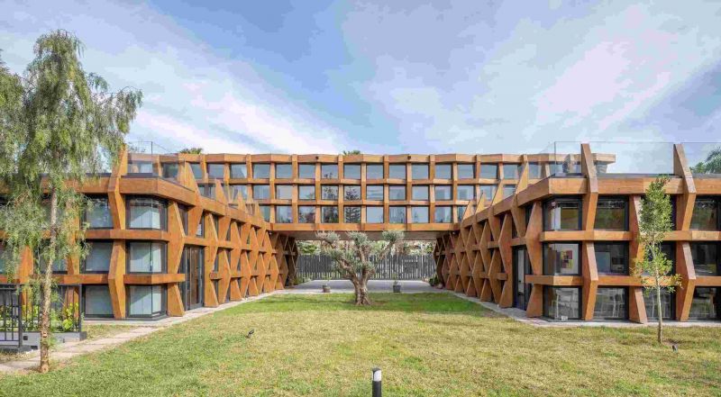 La construcción en madera también responde a las limitaciones de tiempo extremadamente ajustadas, y la prefabricación de la fachada de madera facilita un cronograma de construcción reducido. La elección del material de construcción es inseparable del diseño del edificio y la lógica de su implementación, que busca ser rápida, eficiente y ecológica.
