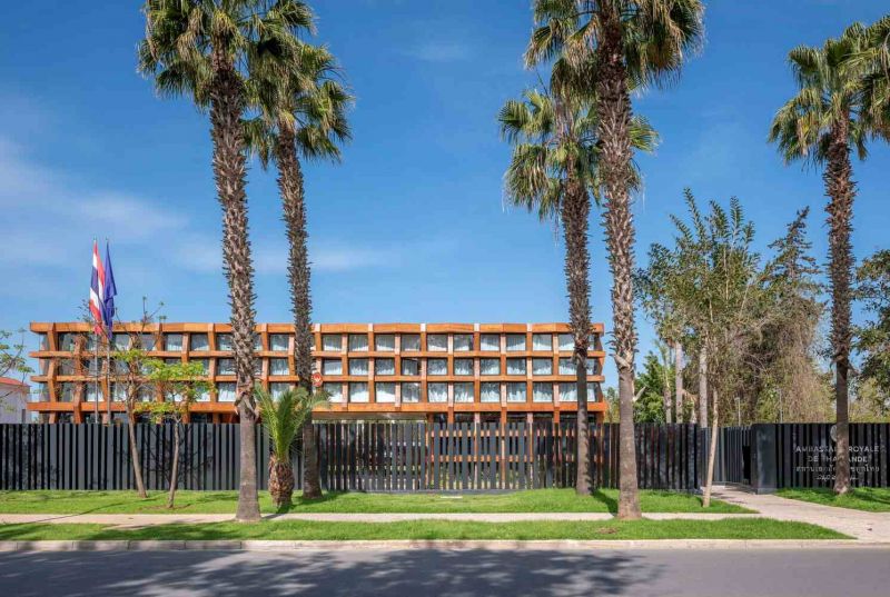 La fachada de madera de la embajada se inspira en la arquitectura tradicional tailandesa y los patrones geométricos de la ebanistería marroquí. El método ancestral de tejido se utiliza como medio de construcción (muros exteriores, tabiques, sombreado) y para diversos objetos y adornos tradicionales. Este proyecto busca fusionar las tradiciones tailandesas y marroquíes en un todo armonioso.