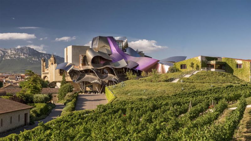 Sin embargo, su relación con nuestro país no quedó ahí, y sus brillantes manos e innovadores métodos de diseño volvieron a pasar por nuestro territorio para llevar a cabo las bodegas del Marqués de Riscal en Elciego (Álava), un edificio que combina el diseño arquitectónico con los colores del vino en su fachada, generando un dinamismo aún mayor si cabe.