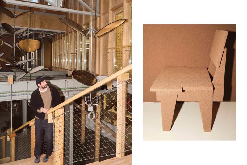 Lucas Muñoz con las lámparas y el mobiliario diseñado para Infinito Delicias (© Santi Sierra)
