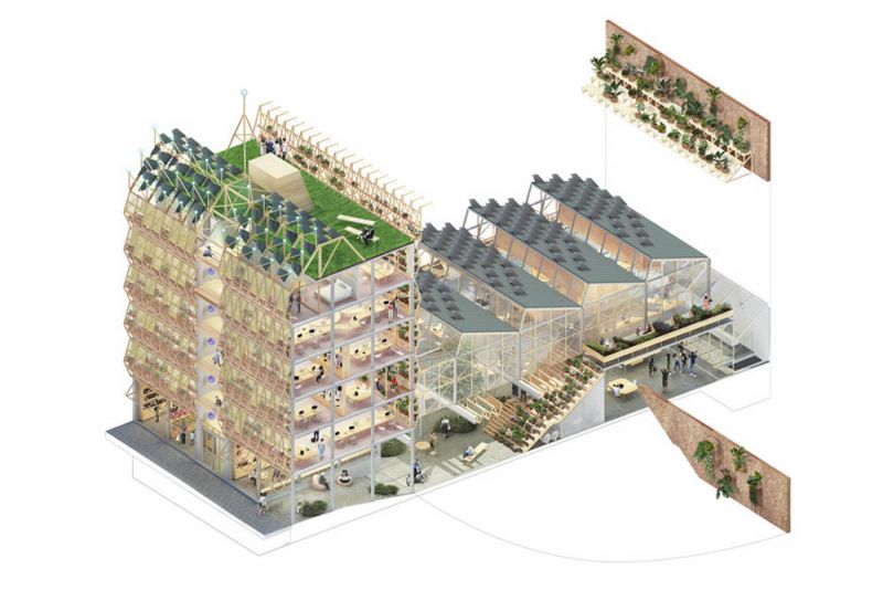 Axonometría de la propuesta para el diseño de Infinito Delicias (© Husos Arquitecturas + Elii)