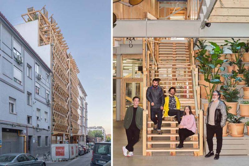 Nacido de un concurso restringido de la Fundación Daniel y Nina Caraso en 2018, la propuesta desarrollada por parte de Elii junto con Husos Arquitecturas esconde un nuevo espacio cultural y de innovación social detrás de una fachada tridimensional de madera en el madrileño barrio de Delicias
