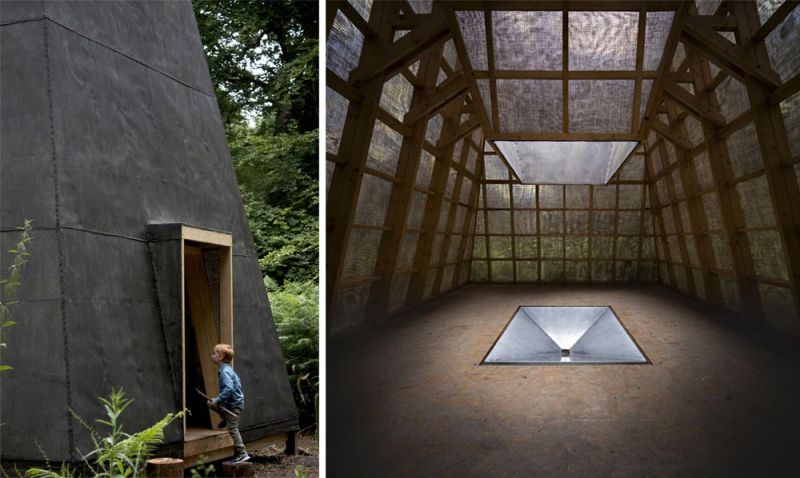 Obligada mención también a las obras de arquitectura efímera, vertiente en auge dentro de muchos estudios que buscan destacar en sus inicios a través de concursos de intervenciones temporales sobre el espacio urbano o el entorno construido. En este caso, el Premio COAM Arquitectura Efímera ha sido entregado a uno de los participantes de nuestro pasado Foro Contract de Madrid, el estudio de arquitectura P+S (Francisco Parada y Laura R. Salvador), por su obra “Compluvium”. Esta obra se erige como una alegoría al agua, buscando poner en valor la condición climática más propia de Rouen y del entorno boscoso de Cateleu. Se trata, por tanto, de un artefacto espacial con carácter atemporal que se define mediante una geometría reconocible, a la par que intenta desaparecer sutilmente mediante un trabajo de pieles de lino y fibra de vidrio.