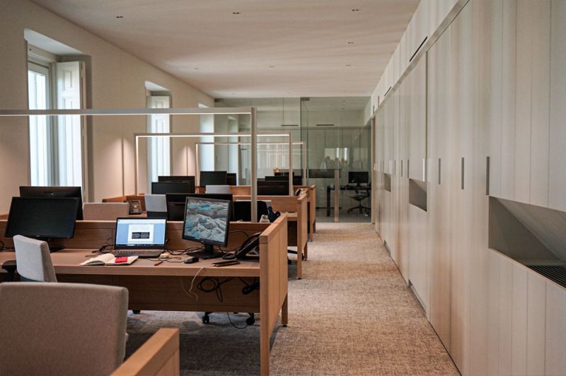 Frente a la fragmentación anterior en habitáculos, la zona de trabajo interna se ha reformulado como un espacio común y abierto en el que el personal de los distintos departamentos se ubica en agrupaciones de mesas. De esta forma, se favorece un modo de trabajo conectado y bien comunicado, que promueve una sensación de equipo único.