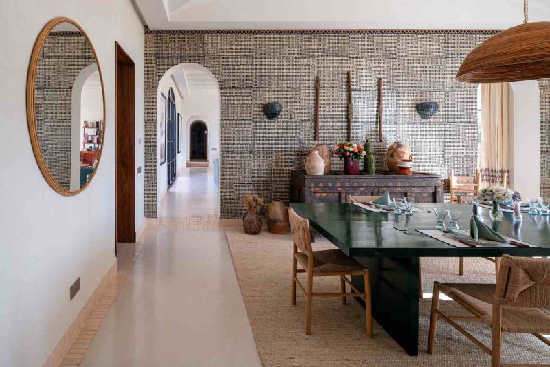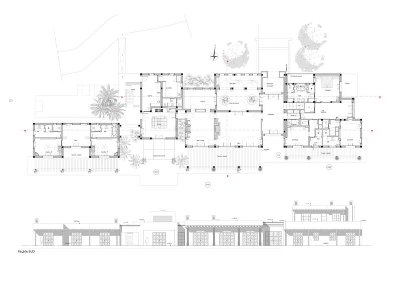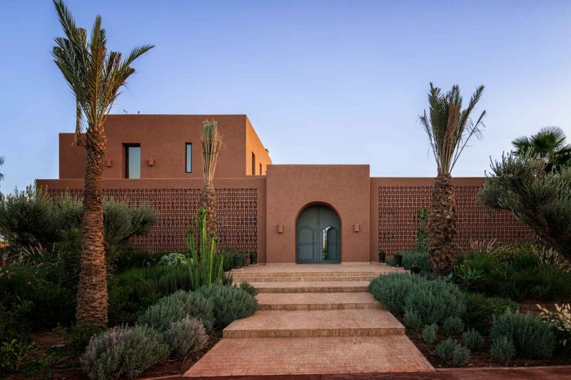 Para la elección de los materiales, nos pareció evidente adoptar una colorimetría local inspirada en las casbahs tradicionales. En el mismo sentido, diseñamos un moucharabieh de ladrillo a medida que participa de esta materialidad y refuerza la singularidad del proyecto. También ayuda a resolver los problemas de calor y a crear efectos luminosos sorprendentes.